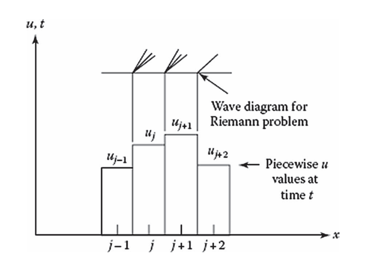 The previous schemes used a Taylor series expansion to approximate spatial and temporal derivatives. This method works well when the series’ convergence criteria are met and the function converges everywhere, meaning the function is continuous and differentiable up until the order of the difference scheme. For shocks and other discontinuities, though, this is not necessarily the case. Godunov (1959) found a way to avoid this differentiability requirement using a finite volume approach to evaluate the fluxes at the cell interface and approximate the conservation equations.
