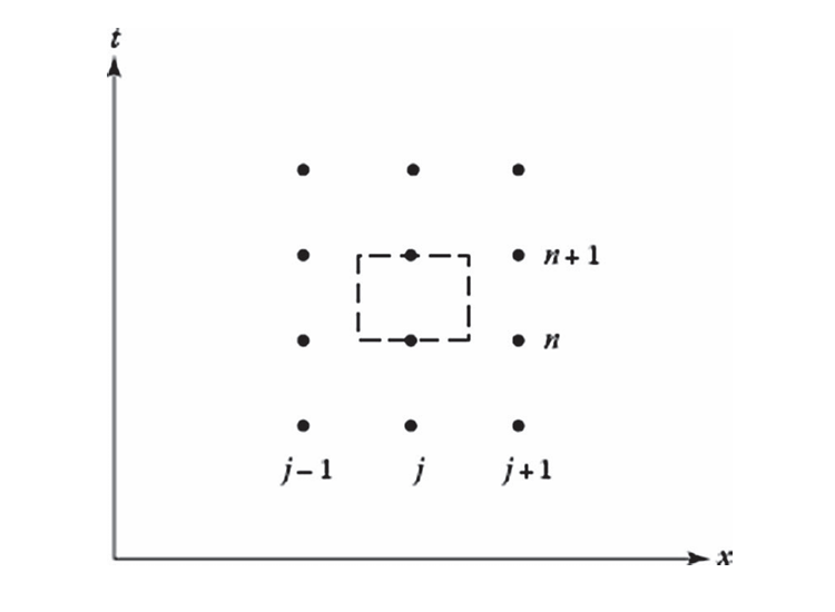 Consider the control volume shown below. The x and y axes are space and time respectively. The control volume extends from x_{j-\frac 12} to x_{j+\frac 12} in space and from t^n to t^{n+1} in time. The center of the control volume is at \left(j,n+\frac 12\right).