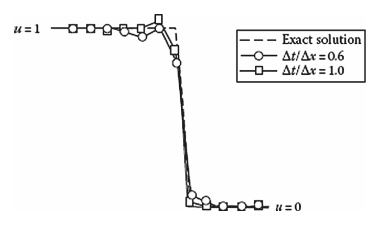 When Lax-Wendroff is applied to the example problem, the method correctly predicts the position of the discontinuity. Moreover, the solution is relatively sharp and well-defined, with some oscillations occurring at either ends of the discontinuity. In comparison, the Lax method was purely monotone and did not exhibit any oscillatory motion due to the method’s lower order accuracy. When the Courant number is decreased, the number of oscillations in the Lax-Wendroff solution increases as the solution quality is degraded.