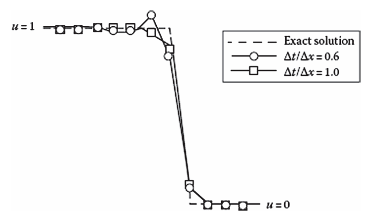 \left|\frac {\Delta t}{\Delta x}u_{\mathrm{max}}\right|\leq1 \tag{8}
